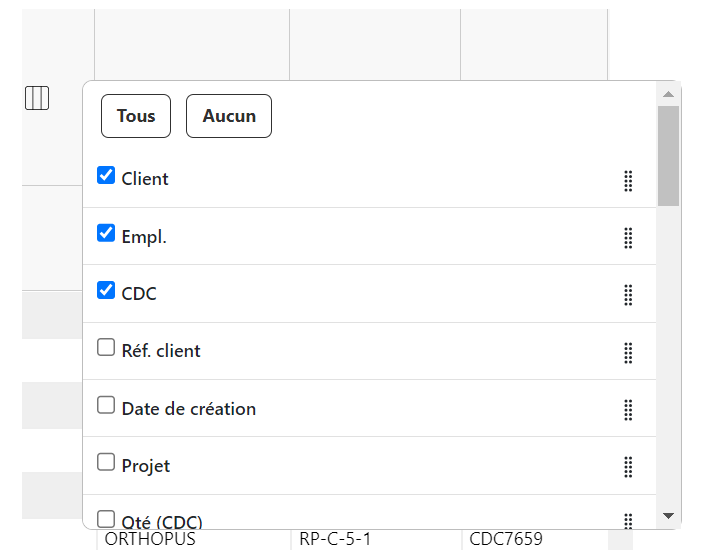 En cliquant sur l’îcone à gauche de la première cellule-titre, il est possible de choisir quelles sont les colonnes à afficher. L’ordre peut être modifié en effectuer un glisser-déposer via la souris.
