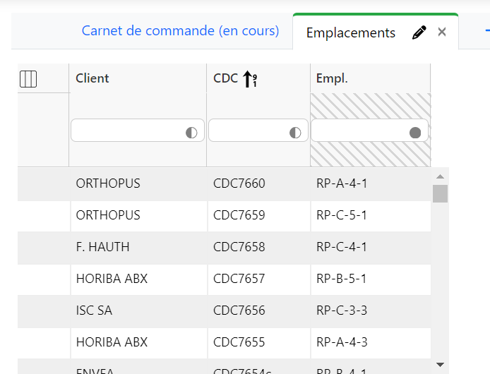 Exemple : deux onglets sont configurés : les en-cours et une vue spécifique sur les emplacements